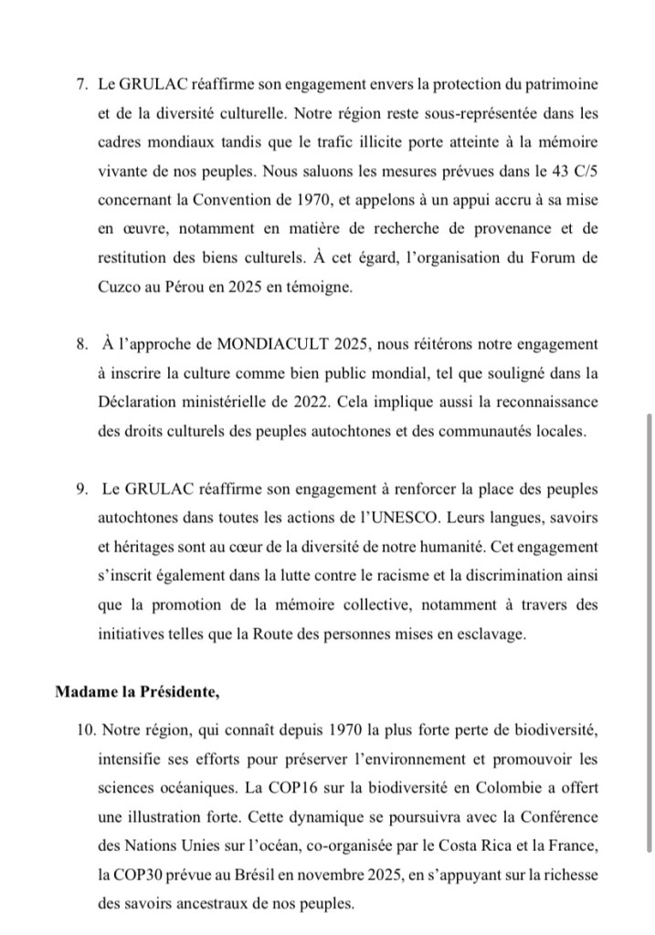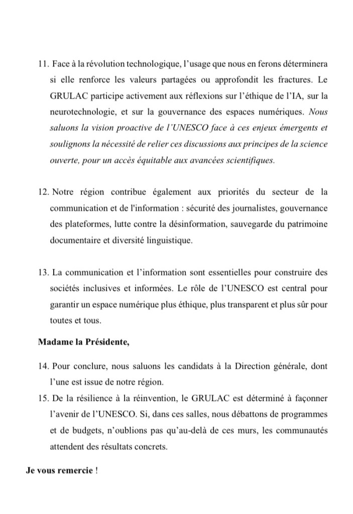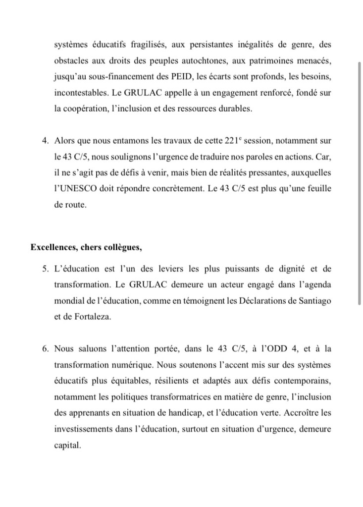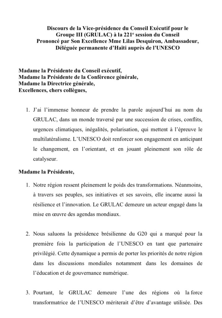 Discours prononcé au nom du GRULAC (Groupe III), par Son Excellence Madame l’Ambassadeur Lilas DESQUIRON, à la 221e session du Conseil exécutif de l’UNESCO le 8 avril 2025.