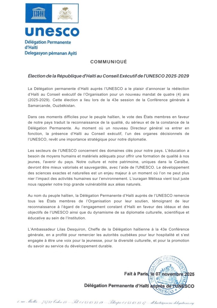 La Délégation permanente d’Haïti auprès de l’UNESCO a le plaisir de partager le communiqué annonçant la réélection d’Haïti au Conseil exécutif de l’Organisation pour la période 2025-2029.